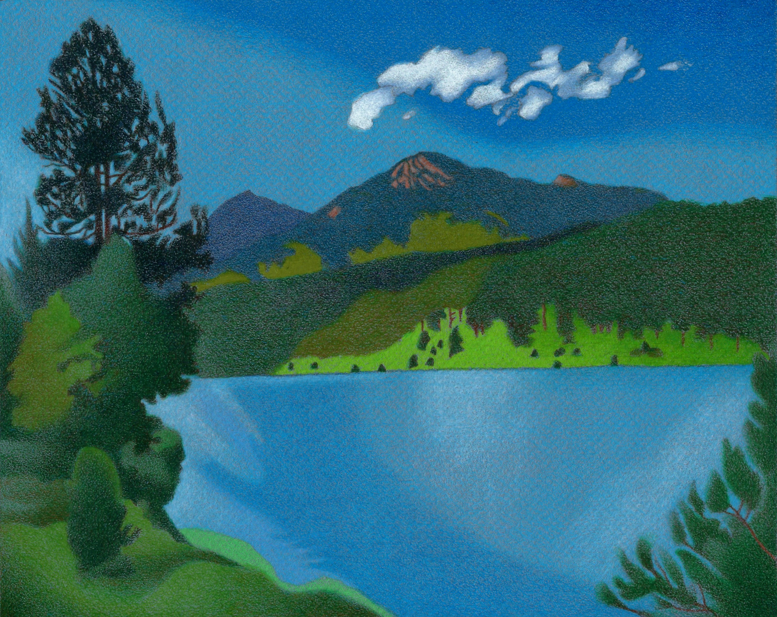 The lower foothills are arranged in a simple pattern described by descending layers of woven color that cascade down to the water’s edge. Glittering white waves are represented by milky tones that are scrubbed softly across the reservoir’s textured surface.