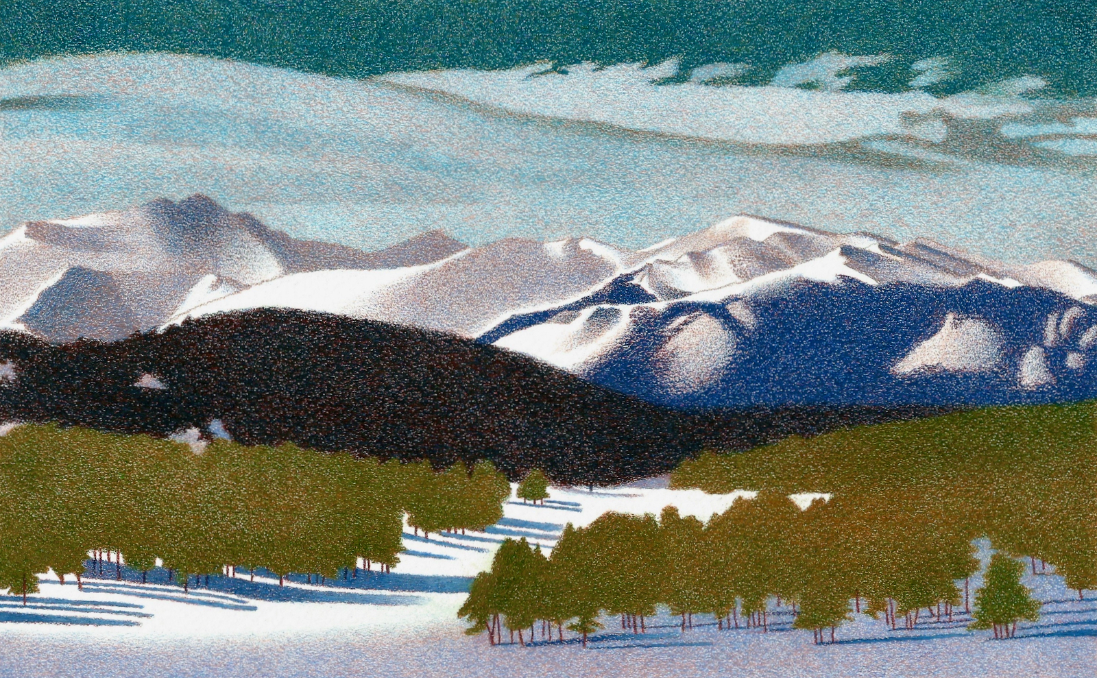 The forested foothills are distinguished by three different, overlapping tiers of conifers. As the woodland ramparts recede into the distance, the wintery colors gradually become several shades bluer.