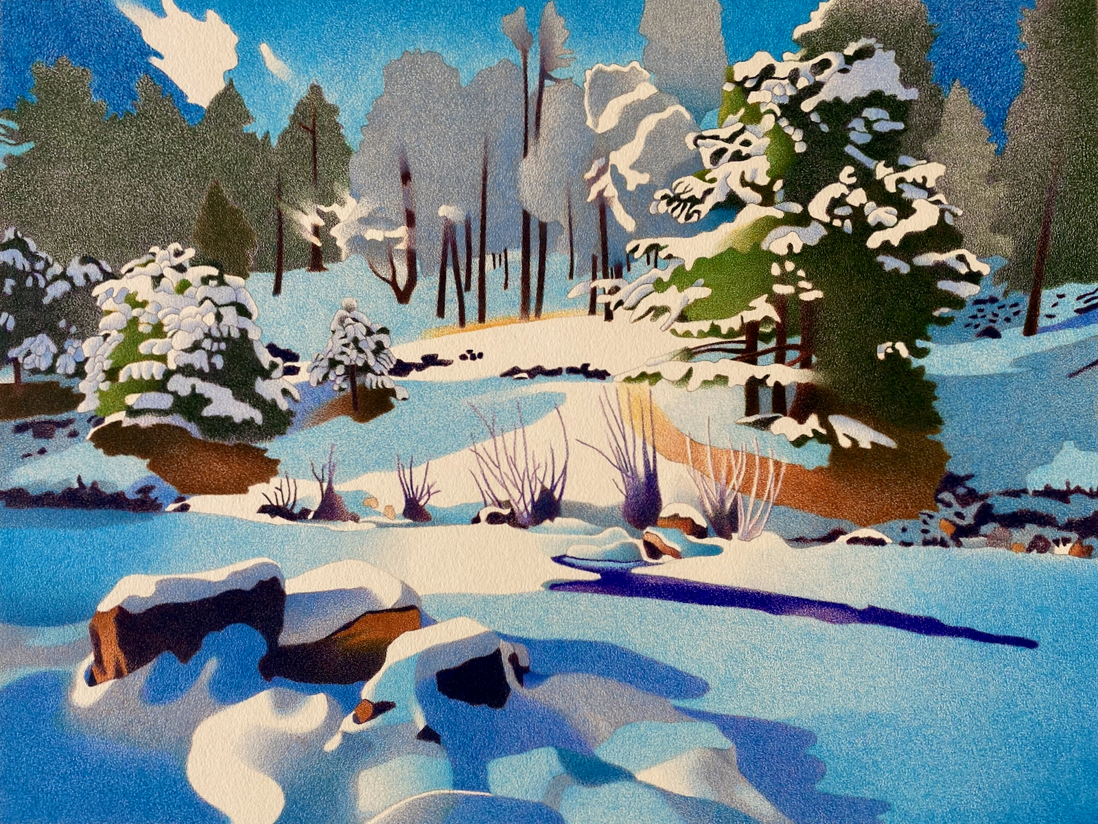 Anchoring the foreground, a pile of snow-covered rocks exhibit unusual forms that are suggested by a patchwork of soft shading. The hidden creek, also camouflaged by snow, is barely discernible except for a sliver of icy water that reflects the surrounding scenery.