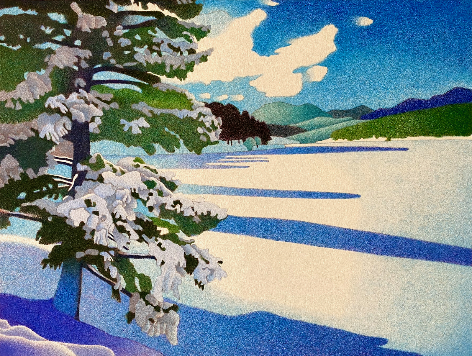 The towering tree in front is backlit but its form is modeled by paler passages of snow that cling to limber branches. Subtle variations of dark green describe the heart of the coniferous sentry while slight tinges of yellow bleed through its transparent edges.