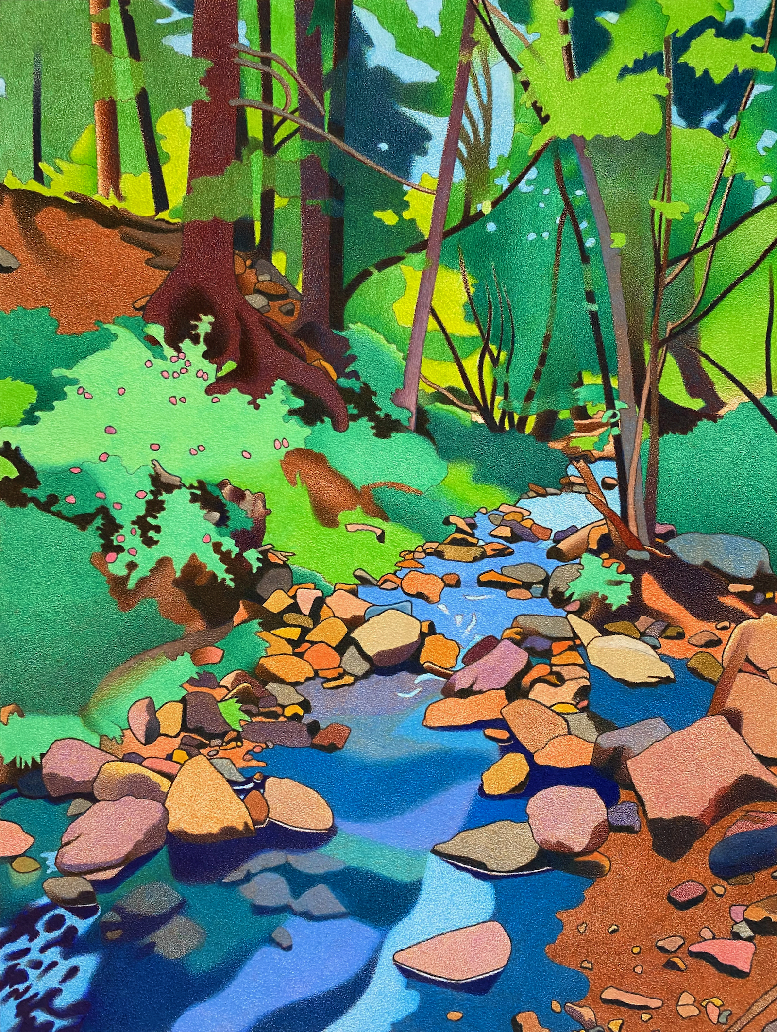Rocks of various shapes and sizes are strewn haphazardly along the edge of the pristine water course. The boulders are filled with smooth color while their contours are sketched with dark outlines conveying a solidity that contrasts with the fluidity of the creek.
